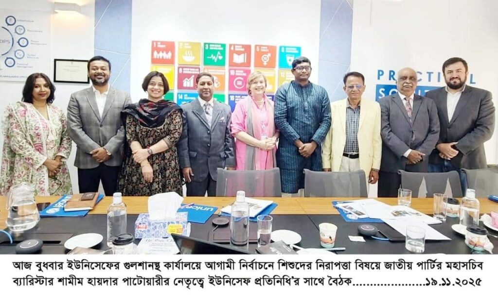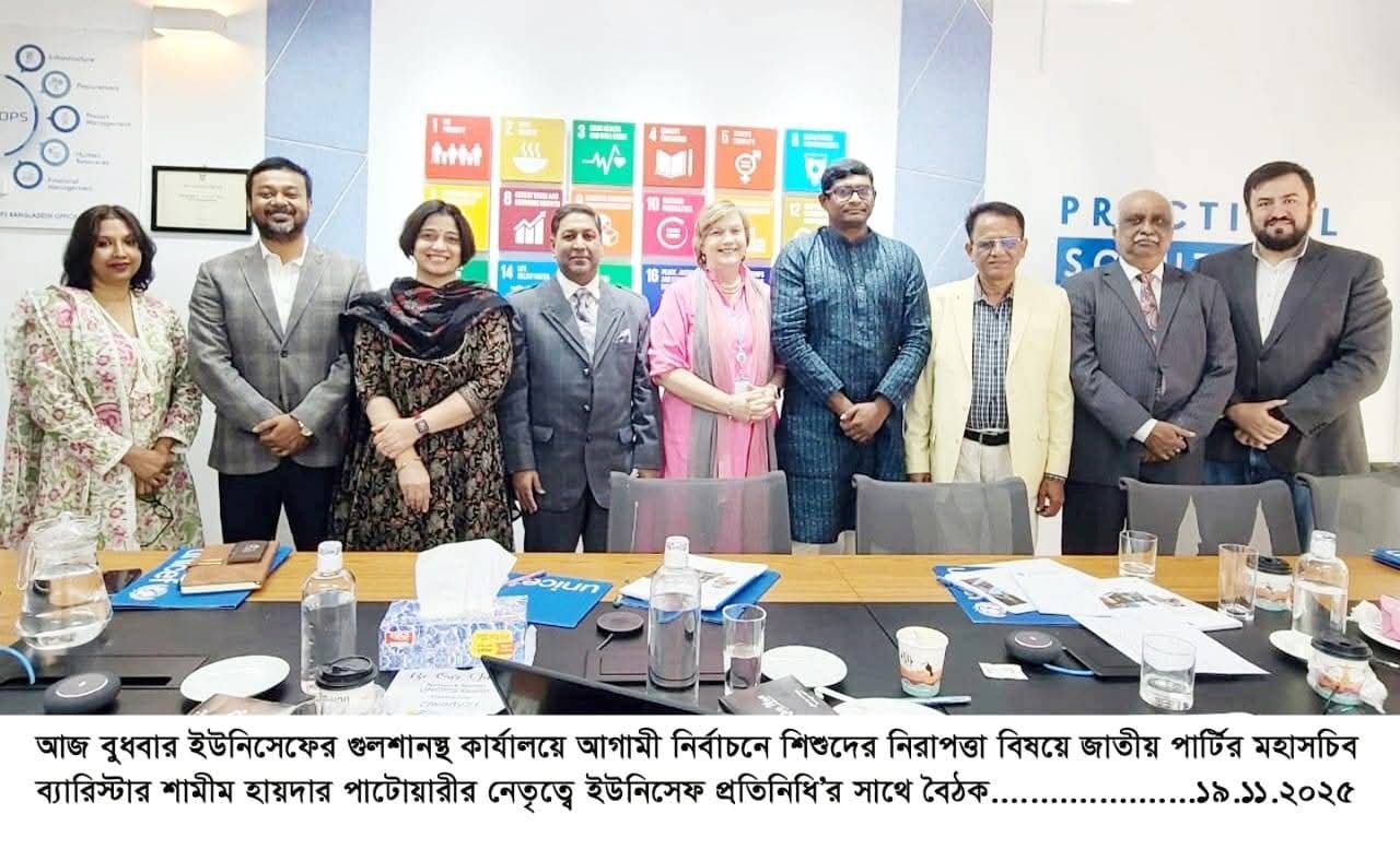 নিজস্ব প্রতিবেদকঃ গতকাল ১৯ নভেম্বর ২০২৫, ইউনিসেফের গুলশানস্থ বাংলাদেশ, কার্যালয়ে ইউনিসিফের একটি প্রতিনিধি দলের সাথে জাতীয় পার্টির মহাসচিব শামীম হায়দার পাটোয়ারীর নেতৃত্বে বৈঠক অনুষ্ঠিত হয়।