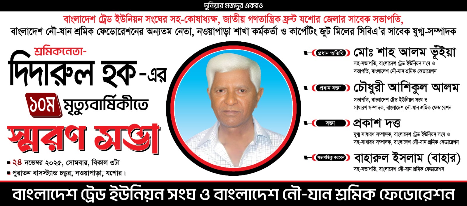এছাড়া আগামীকাল দশম মৃত্যুবার্ষিকী উপলক্ষে প্রতিবছরের ন্যায় এক বিশাল শোক সভা আগামীকাল বিকাল তিনটায় নোয়াপাড়া বাস স্ট্যান্ডে অনুষ্ঠিত হবে। সভাটি সভাপতিত্ব করবেন বাহারুল ইসলাম (বাহার), সভায় প্রধান অতিথি হিসেবে উপস্থিত থাকবেন মোঃ শাহ আলম ভূঁইয়া, প্রধান বক্তা হিসেবে থাকবেন চৌধুরী আশিকুল আলম এবং বক্তা হিসেবে থাকবেন প্রকাশ দত্ত। আশা করি আপনারা সকলে দলে দলে যোগ দিয়ে শোক সভাকে সফল্যমুন্ডিত করে তুলবেন।