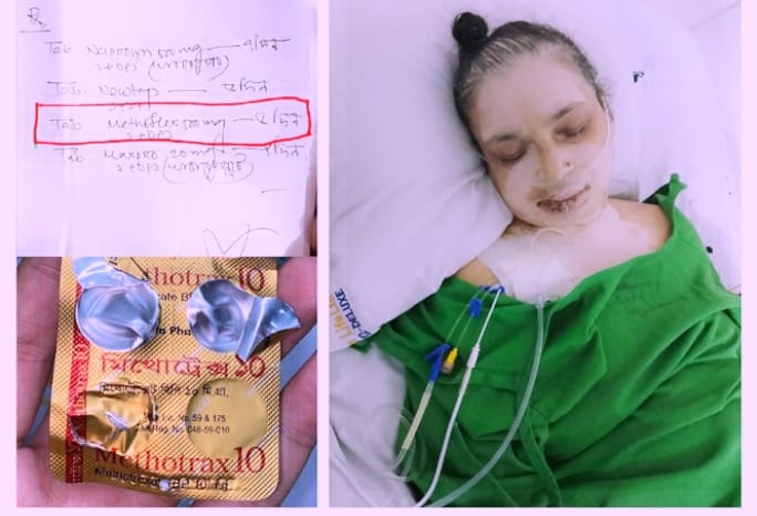 নিজস্ব প্রতিবেদকঃ রাজধানীর মিরপুরে লাজফার্মার অবহেলার কারণে ভয়াবহ বিপদের মুখে পড়েছেন কামাল হাউজিংয়ের বাসিন্দা খালেদা আক্তার রিনা (৪৫)। চিকিৎসকের প্রেসক্রিপশনে থাকা Methoflex 500 mg-এর পরিবর্তে ফার্মেসি থেকে তাকে তুলে দেওয়া হয় সম্পূর্ণ ভিন্ন ধরনের ও অত্যন্ত শক্তিশালী কেমোথেরাপি-জাতীয় ওষুধ Methotrexate 10 mg—এক পুরো পাতায় মোট ১০টি ট্যাবলেট। ভুল ওষুধ সেবনের পর থেকেই রিনার শারীরিক অবস্থা দ্রুত অবনতি হতে থাকে। লিভার ও কিডনি মারাত্মকভাবে ক্ষতিগ্রস্ত হয়, মাথা ও ভ্রুর চুল পড়ে যেতে শুরু করে।